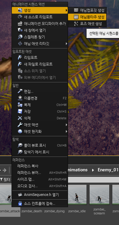 애니메이션 마우스오른쪽 버튼 -> 생성 -> 애님몽타주생성