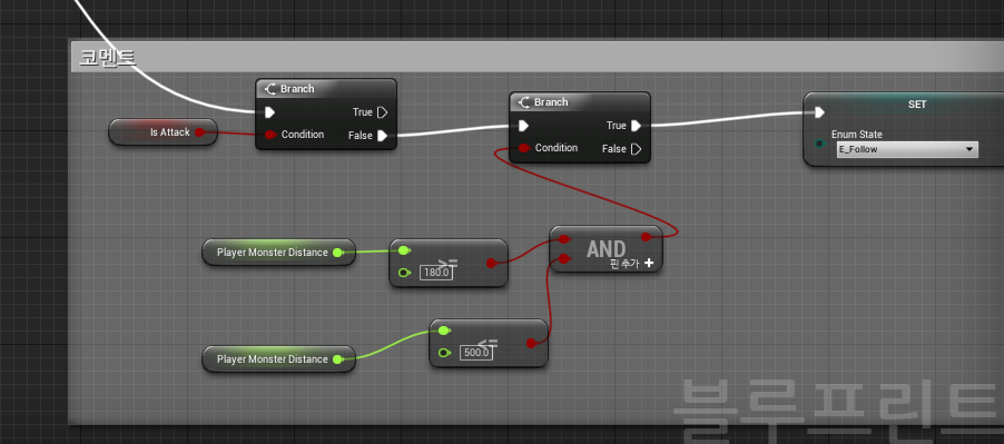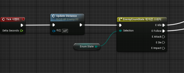 변수로 EnumState(변수 유형은 만들어준 열거형의 이름으로한다)를 생성하고 Update Distance 앞에 EnemyEnumState에 따른 스위치를 추가하여준다. 그 뒤 이동 부분과, 이동후 움직임 부분을 따로 구분하여 만들어준다.