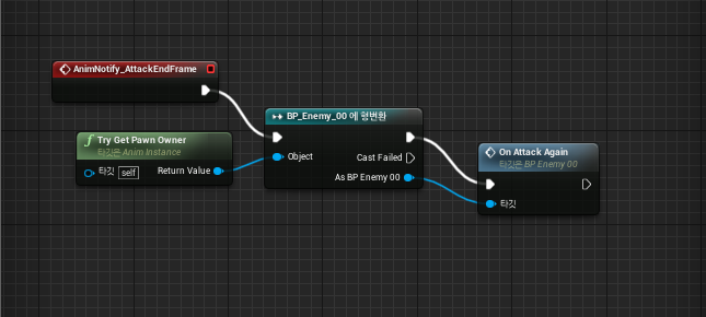 IsAttack문을 다시 켜주는 형식이다. 그 뒤에 처음에 만들어준 애니메이션 블루프린트의 이벤트 그래프에 해당 커스텀 이벤트를 실행 시켜 주면 된다. Enemy 블루프린트를 형변환 하여 다음과 같은 커스텀 이벤트를 실행시켜주는 형식이다.