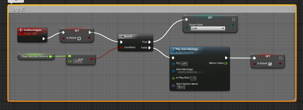 거리가 다음과 같을 경우에 Attack중이 아니면 Idle, 맞다면 몽타주를 다시 재생시켜주고