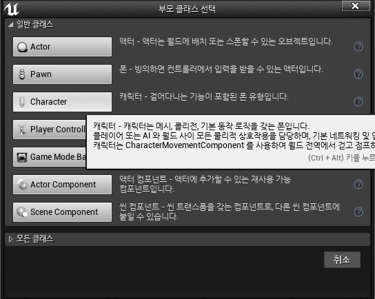 그 뒤에 새로운 블루프린트를 만들것인데, 블루프린트 클래스는 캐릭터로 만든다.
