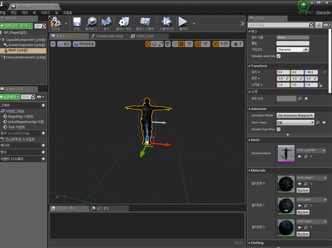 블루프린트를 열면 다음과 같은 화면이 나오게 되는데 그중에 Mesh에 있는 Skeletal Mesh를 다운로드 받은 Ch35_nonPBR로 설정해 주면 된다. 위치는 캡슐에 맞게 알아서 설정해 주자.