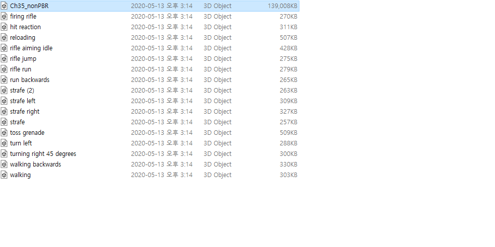 그럼 다음과 같은 파일이 생성되는데, 그중에 ch35_nonPBR이라고 적혀있는 파일을 가장 먼저 언리얼 엔진에 임포트 할 것이다. (애니메이션의 뼈대가 될 것임) 임포트는 그냥 파일을 끌어다가 언리얼엔진에다가 넣어두면 된다. 매우간단하다.