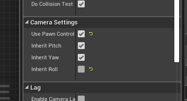 그럴땐 SpringArms 의 카메라 세팅에 다음과 같이 설정해 주면 된다.(Roll이 체크되어 있는 것을 체크해제하며 UsePawnControllRotation 을 체크해게 되면 자연스러운 회전을 하게된다.