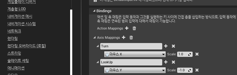 카메라를 움직이기 위해서는 편집 - 프로젝트 세팅 - 입력 창에 다음과 같이 설정해준다.