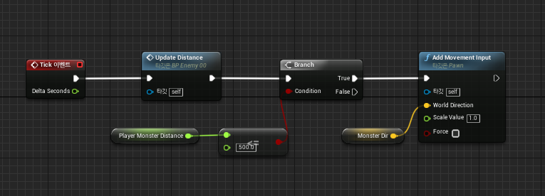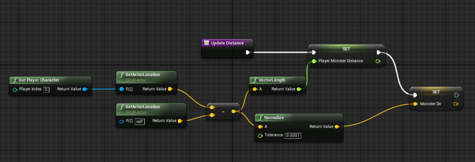 플레이어캐릭터의 Location과 Actor(적군)Location를 빼준 뒤 벡터를 변환하여 만들어놓은 PlayerMonsterDistance와 MonsterDir에 저장하여 사용하는 방식이다.