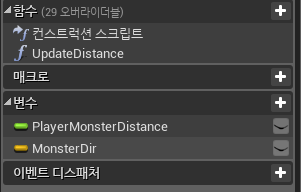 PlayerMonsterDistance라는 float 변수, MonsterDir이라는 Vector변수를 이용하여 계산을 할 것이다.